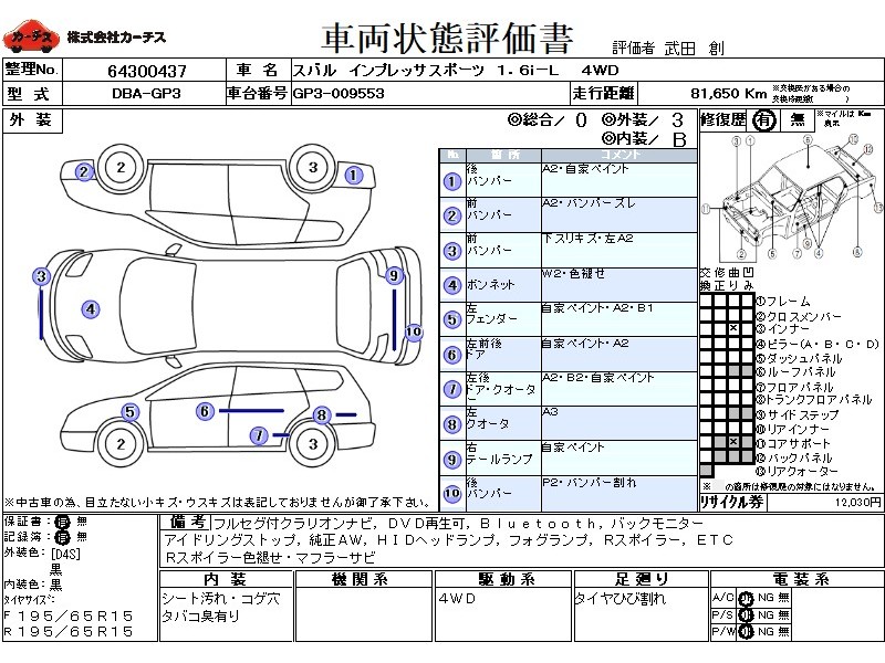 フル装備 / CD(社外) / 乗車定員(5人) / エアバッグ / 助手席エアバッグ / ABS / トラクションコントロール / カーナビゲーション(社外) / テレビ(社外) / 地デジTV(社外) / ETC(社外) / アルミホイール(15インチ) / キーレスエントリー / ディスチャージ / ハイマウントストップランプ / フォグランプ / リアスポイラー /