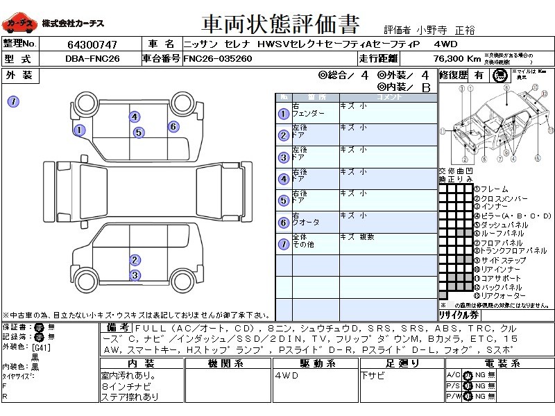 フル装備 / CD / 乗車定員(8人) / 集中ドアロック / エアバッグ / 助手席エアバッグ / ABS / トラクションコントロール / クルーズコントロール / カーナビゲーション(インダッシュ,SSD,2DIN) / テレビ(アナログ) / フリップダウンモニタ / バックカメラ / ETC / アルミホイール(15インチ) / スマートキー / ハイマウントストップランプ / パワースライドドア / フォグランプ / サイドスポイラー /