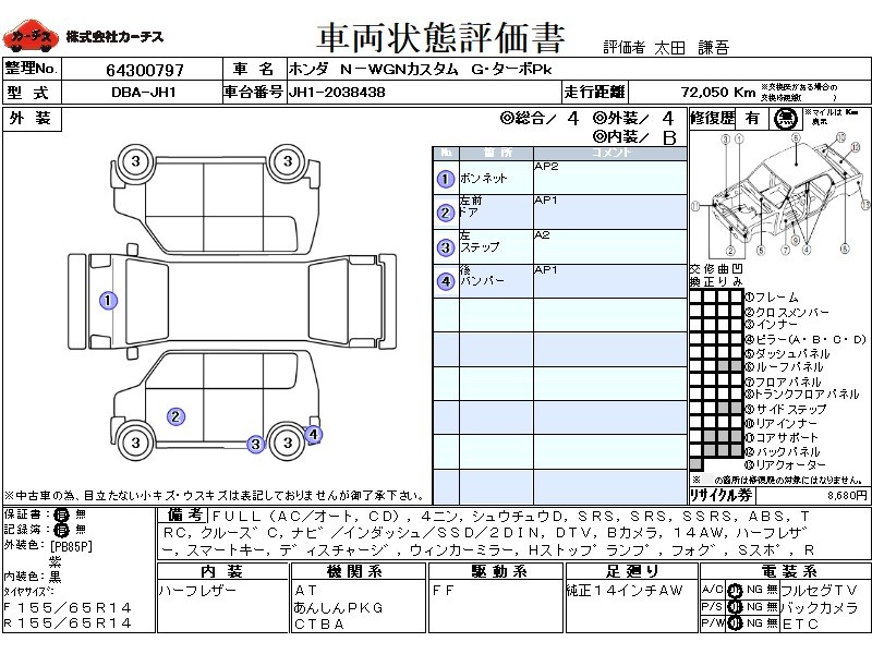フル装備 / CD / 乗車定員(4人) / 集中ドアロック / エアバッグ / 助手席エアバッグ / サイドエアバッグ / ABS / トラクションコントロール / クルーズコントロール / カーナビゲーション(インダッシュ,SSD,2DIN) / 地デジTV / バックカメラ / ETC(社外) / アルミホイール(14インチ) / ハーフレザーシート / スマートキー / ディスチャージ / ウインカーミラー / ハイマウントストップランプ / フォグランプ / サイドスポイラー / リアスポイラー /