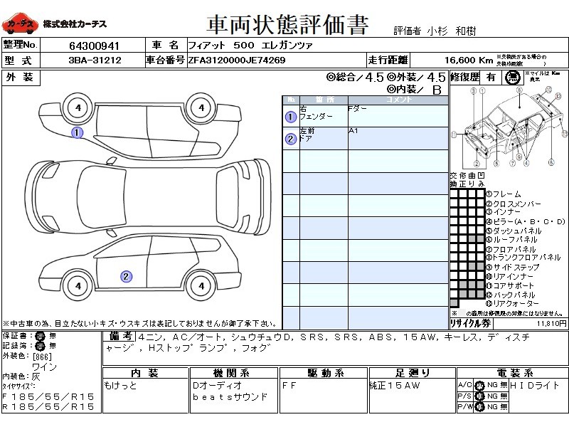 乗車定員(4人) / エアコン(オート) / パワーステアリング / パワーウィンドウ / 集中ドアロック / エアバッグ / 助手席エアバッグ / ABS / アルミホイール(15インチ) / キーレスエントリー / ディスチャージ / ハイマウントストップランプ / フォグランプ /