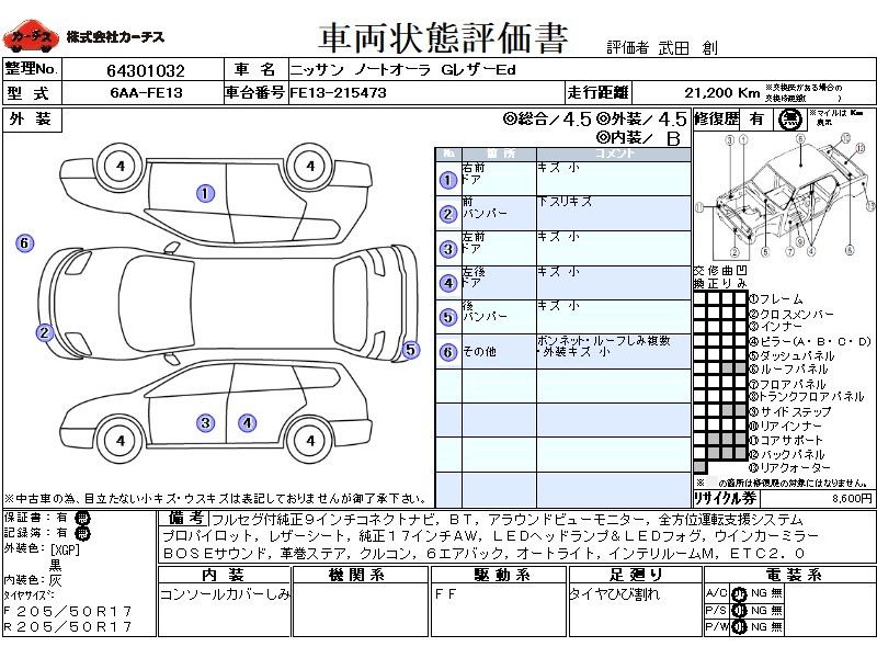 乗車定員(5人) / エアコン(オート) / パワーステアリング / パワーウィンドウ / エアバッグ / 助手席エアバッグ / サイドエアバッグ / ABS / クルーズコントロール / カーナビゲーション(SSD) / テレビ(アナログ) / 地デジTV / バックカメラ / ETC / アルミホイール(17インチ) / 革シート(グレー) / スマートキー / ウインカーミラー / ハイマウントストップランプ / フォグランプ / リアスポイラー / リアアンダースポイラー /