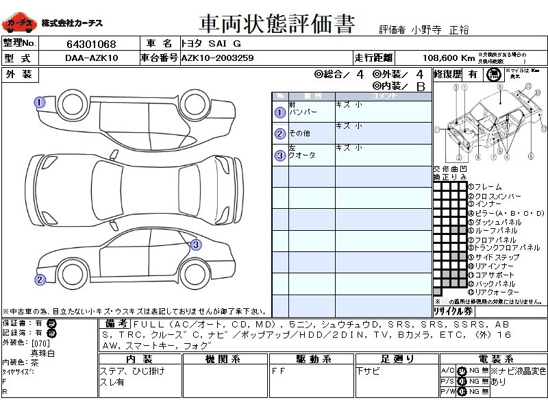 フル装備 / CD / MD / 乗車定員(5人) / 集中ドアロック / エアバッグ / 助手席エアバッグ / サイドエアバッグ / ABS / トラクションコントロール / クルーズコントロール / カーナビゲーション(ポップアップ,HDD,2DIN) / テレビ(アナログ) / バックカメラ / ETC / アルミホイール(社外)(16インチ) / スマートキー / フォグランプ /