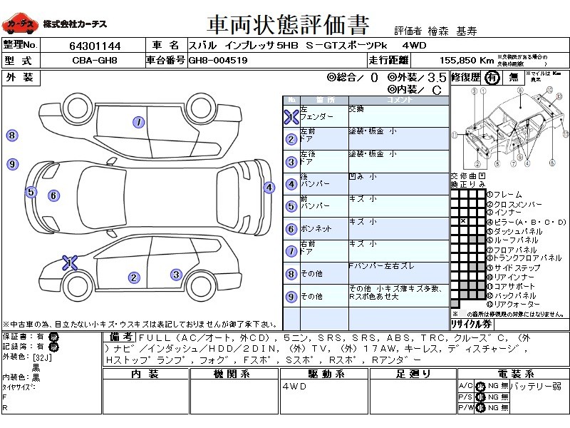 フル装備 / CD(社外) / 乗車定員(5人) / エアバッグ / 助手席エアバッグ / ABS / トラクションコントロール / クルーズコントロール / カーナビゲーション(社外)(インダッシュ,HDD,2DIN) / テレビ(社外) / 地デジTV(社外) / アルミホイール(社外)(17インチ) / キーレスエントリー / ディスチャージ / ハイマウントストップランプ / フォグランプ / フロントスポイラー / サイドスポイラー / リアスポイラー / リアアンダースポイラー / マフラー(社外) / 足回り /