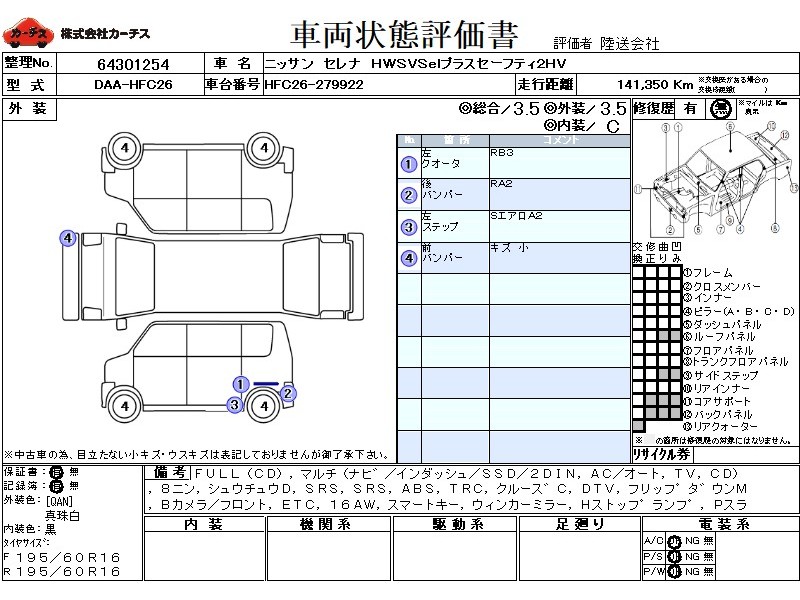 フル装備 / CD / マルチ(ナビ) / エアコン(オート) / テレビ(アナログ) / 乗車定員(8人) / 集中ドアロック / エアバッグ / 助手席エアバッグ / ABS / トラクションコントロール / クルーズコントロール / 地デジTV / フリップダウンモニタ / バックカメラ(フロント) / ETC / アルミホイール(16インチ) / スマートキー / ウインカーミラー / ハイマウントストップランプ / パワースライドドア / サイドスポイラー /