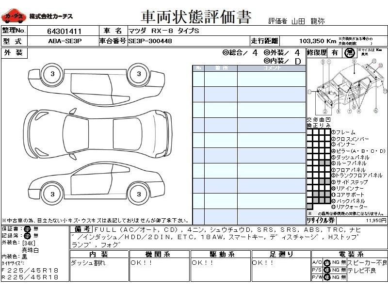 フル装備 / CD / 乗車定員(4人) / 集中ドアロック / エアバッグ / 助手席エアバッグ / ABS / トラクションコントロール / カーナビゲーション(インダッシュ,HDD,2DIN) / ETC / アルミホイール(18インチ) / スマートキー / ディスチャージ / ハイマウントストップランプ / フォグランプ /