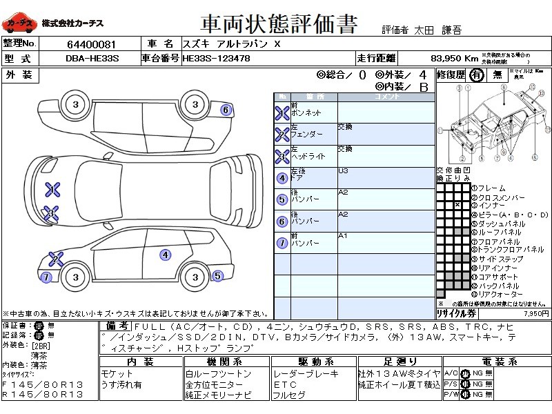 フル装備 / CD / 乗車定員(4人) / 集中ドアロック / エアバッグ / 助手席エアバッグ / ABS / トラクションコントロール / カーナビゲーション(インダッシュ,SSD,2DIN) / 地デジTV / バックカメラ(サイドカメラ) / ETC(社外) / アルミホイール(社外)(13インチ) / スマートキー / ディスチャージ / ハイマウントストップランプ /