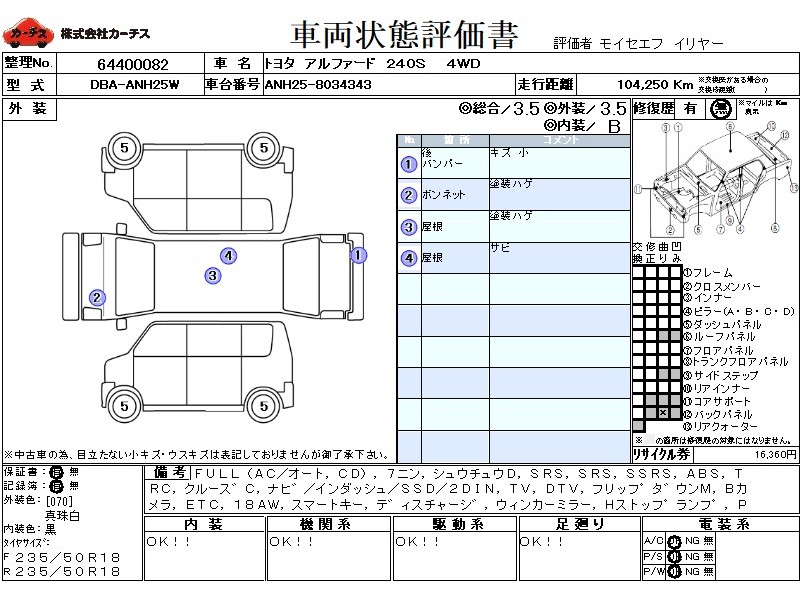 フル装備 / CD / 乗車定員(7人) / 集中ドアロック / エアバッグ / 助手席エアバッグ / サイドエアバッグ / ABS / トラクションコントロール / クルーズコントロール / カーナビゲーション(インダッシュ,SSD,2DIN) / テレビ(アナログ) / 地デジTV / フリップダウンモニタ / バックカメラ / ETC / アルミホイール(18インチ) / スマートキー / ディスチャージ / ウインカーミラー / ハイマウントストップランプ / パワースライドドア / フォグランプ / サイドスポイラー / リアスポイラー /