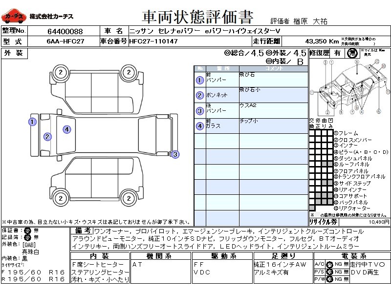フル装備 / CD / 乗車定員(7人) / エアバッグ / 助手席エアバッグ / サイドエアバッグ / ABS / トラクションコントロール / クルーズコントロール / カーナビゲーション(インダッシュ,2DIN) / 地デジTV / フリップダウンモニタ / バックカメラ(フロント) / ETC / アルミホイール(16インチ) / スマートキー / ウインカーミラー / パワースライドドア / フォグランプ / フロントスポイラー / サイドスポイラー / リアスポイラー /