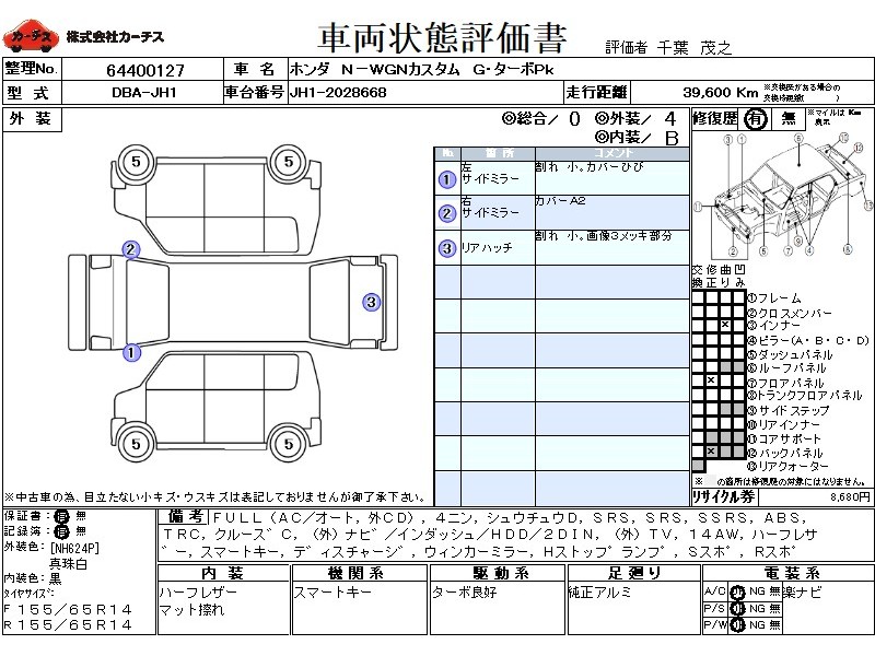 フル装備 / CD(社外) / 乗車定員(4人) / 集中ドアロック / エアバッグ / 助手席エアバッグ / サイドエアバッグ / ABS / トラクションコントロール / クルーズコントロール / カーナビゲーション(社外)(インダッシュ,HDD,2DIN) / テレビ(社外) / 地デジTV(社外) / ETC(社外) / アルミホイール(14インチ) / ハーフレザーシート / スマートキー / ディスチャージ / ウインカーミラー / ハイマウントストップランプ / サイドスポイラー / リアスポイラー /