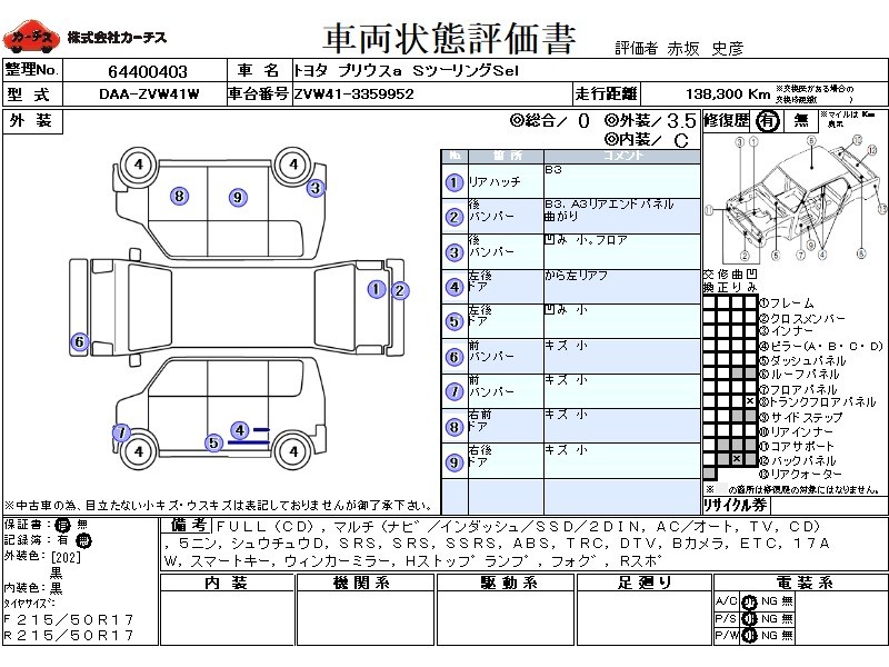 フル装備 / CD / マルチ(ナビ) / エアコン(オート) / テレビ(アナログ) / 乗車定員(5人) / 集中ドアロック / エアバッグ / 助手席エアバッグ / サイドエアバッグ / ABS / トラクションコントロール / 地デジTV / バックカメラ / ETC / アルミホイール(17インチ) / スマートキー / ウインカーミラー / ハイマウントストップランプ / フォグランプ / リアスポイラー /