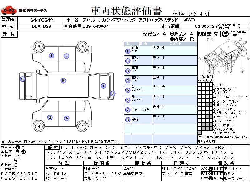 フル装備 / CD / 乗車定員(5人) / 集中ドアロック / エアバッグ / 助手席エアバッグ / サイドエアバッグ / ABS / トラクションコントロール / クルーズコントロール / カーナビゲーション(インダッシュ,SSD,2DIN) / テレビ(アナログ) / 地デジTV / バックカメラ(サイドカメラ) / ETC / アルミホイール(18インチ) / 革シート(黒) / スマートキー / ウインカーミラー / ハイマウントストップランプ / パワーバックドア / フォグランプ / ルーフレール / リアスポイラー /